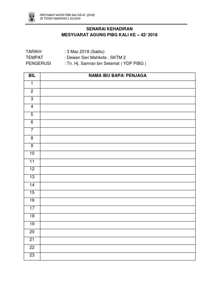 Borang Kehadiran Mesyuarat Agung Persatuan Ibu Bapa Dan Guru Pdf